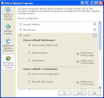 Click ‘Start‘ and then select “Set Program access and defaults“. If this is not listed in the start menu then go to Control Panel -> Add or Remove Programs and then select “Set Program access and defaults” in the left side menu. Now expand the Custom node.